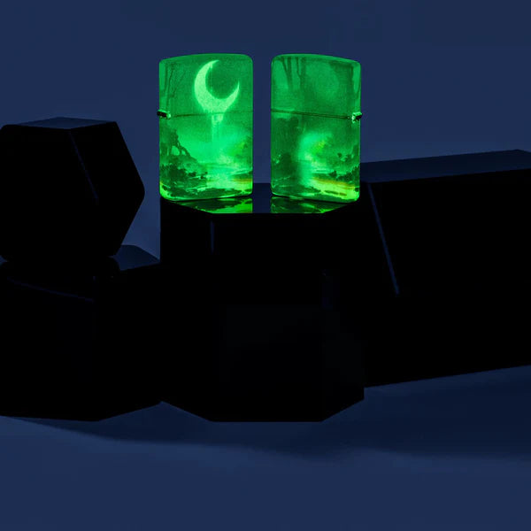 A dreamy, moonlit landscape extends around all sides of this gorgeous 540 Color lighter, which is treated with our specialty Glow-in-the-Dark finish for extra romance. Comes packaged in a gift box. For optimal performance fill with Zippo lighter fuel.