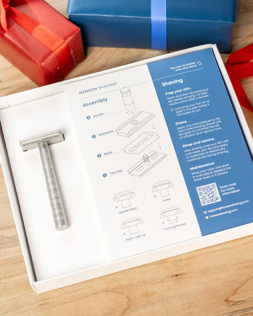 This set makes for the perfect gift. Contains the aerospace quality Henson Razor, matching Henson Stand and two years (or more) of blades, all packaged in a single gift-ready box. It's a gift they'll continue to use, and benefit from for years to come. They won't forget who gave it to them.